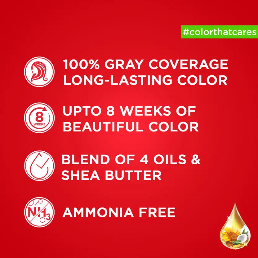 Revlon Color N Care gives complete nourishment & care with 4 essentials oils of Argan, Sunflower, Coconut & Jojoba oil, along with shea butter to give beautifully colored silky & shiny hair, which last up to 8 weeks with 100% GRAY COVERAGE and NO AMMONIA. Argan and Sunflowe oil are rich in vitamin E, which supplies radiace and enhances shine. Coconut oil is able to penetrate inside the hair fiber and provide nourishment. Shea butter is known for its natural ability to reduce dry hair and provide a softening effect. Jojoba oil has condiitoning properties that help to improve hair managebility.