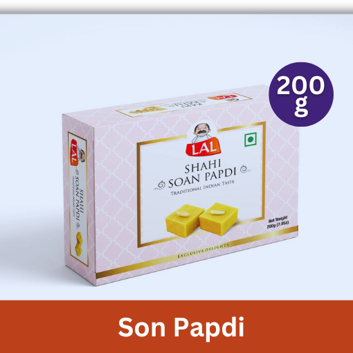 The LAAL SHAHI SOAN PAPDI 200G is a classic Indian confection that melts delicately in the mouth, featuring a distinctively light, flaky, and airy texture with a rich, traditional sweet flavour, perfect for gifting or festive indulgence.
