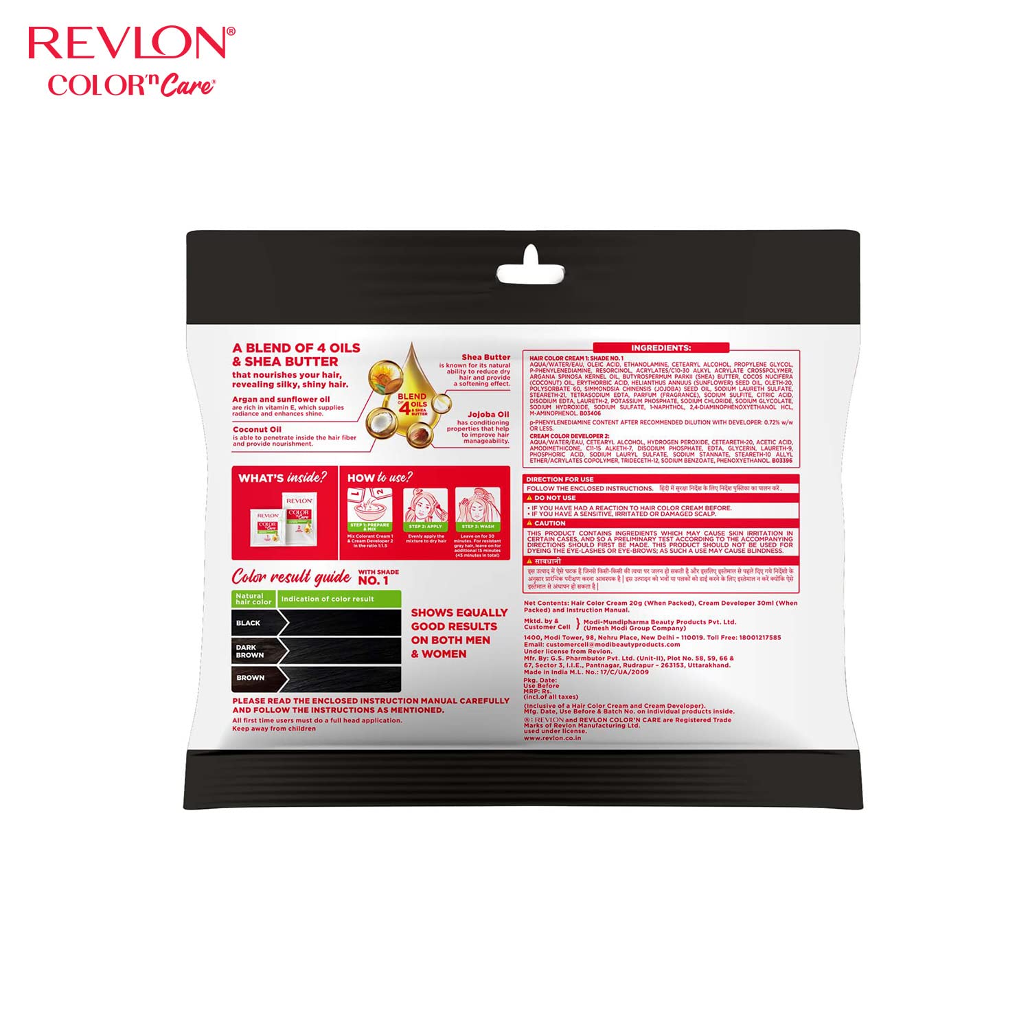 REVLON Color 'n Care NOURISHING PERMANENT HAIR COLOR - 1 Natural Black - Has essentials oils of Coconut Argan, Sunflower & Jojoba oil, along with shea butter - Sachet