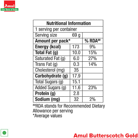 Savour the luscious goodness of Amul Gold Butterscotch Ice Cream. Crafted with care, this delightful treat combines the creamy richness of butterscotch with the renowned quality of Amul. Indulge in the perfect blend of sweet and buttery flavours, creating a heavenly experience in every spoonful. Pure delight in every scoop