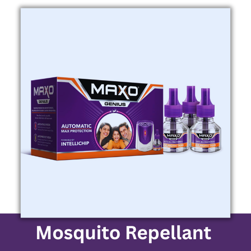 MAXO GENIUS COMBO 1M 1R is a mosquito repellent product that includes one automatic liquid vaporizer machine (1M) and one liquid refill (1R).